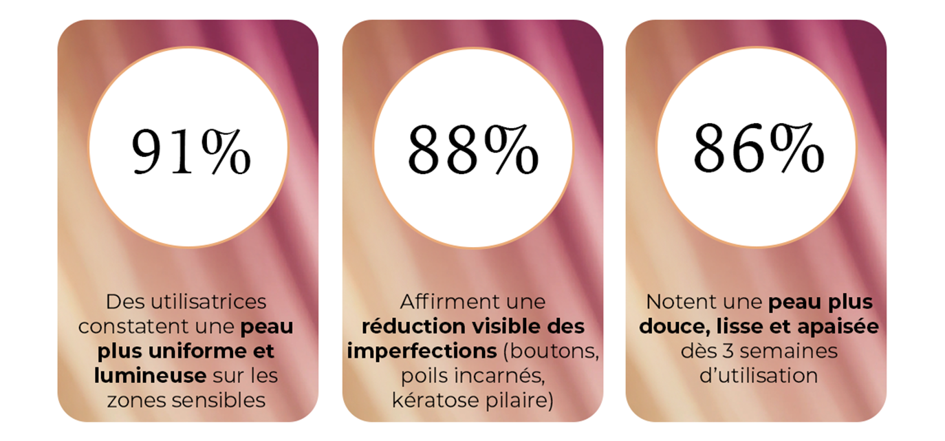 Des résultats visibles en seulement 2 semaines : réduction des boutons et rugosités, atténuation des taches localisées et apaisement des zones sensibles.
